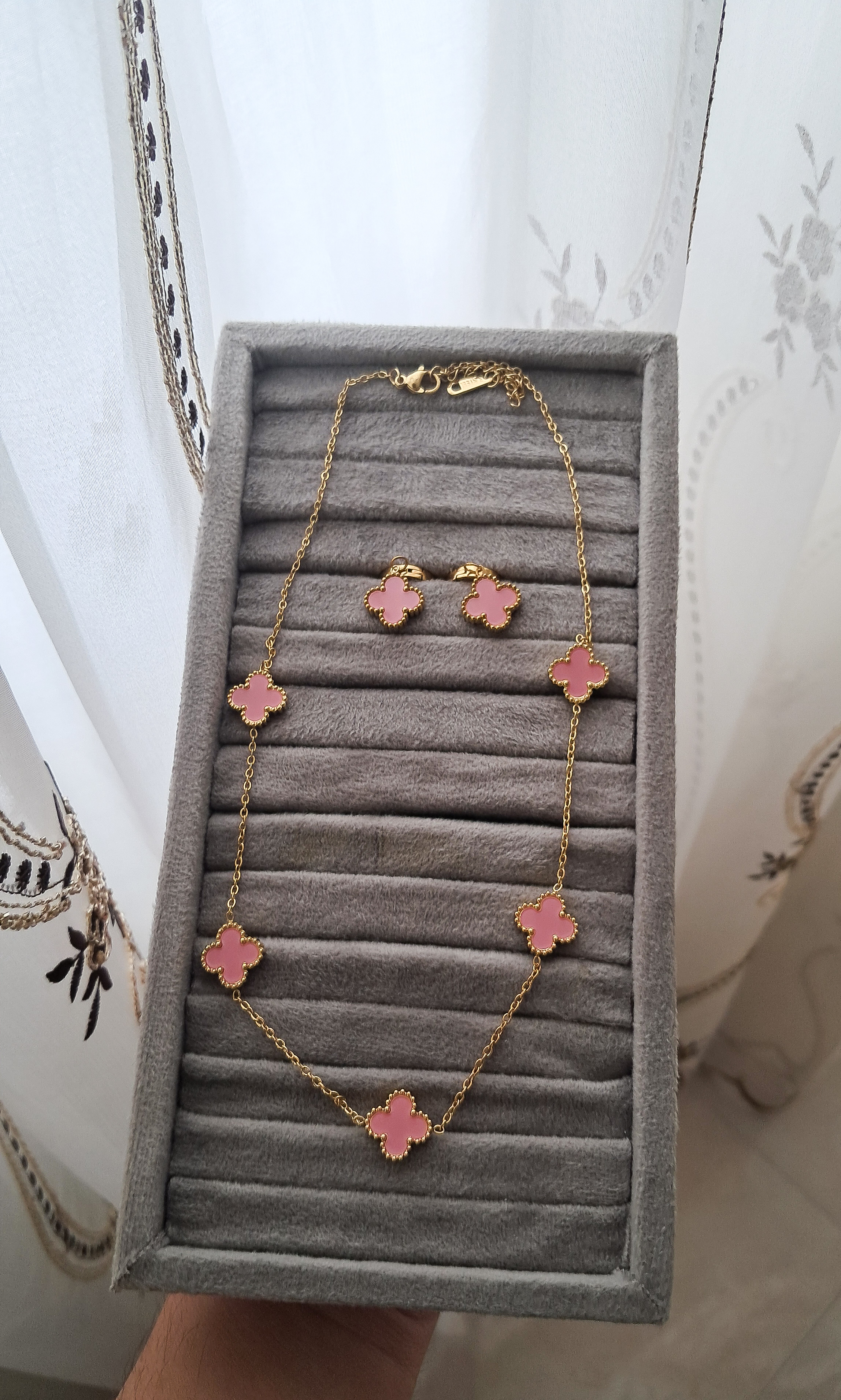 گردنبند ونکلیف که دارای 5 شبدرهستش همراه با گوشواره آویز ونکلیف رنگ صورتی _ هر دو جنسشون استیل -رنگ ثابت-ضد حساسیت